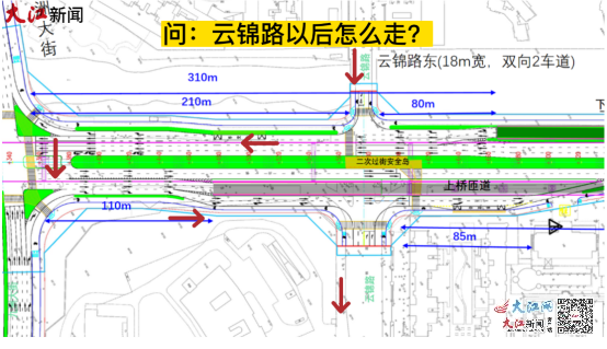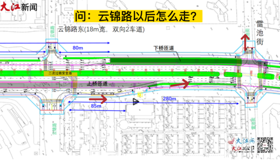 另一方面,如上桥匝道退开云锦路,挪到雷池街甚至更后面,魏星指出,这实际上促使云锦路交通与快速路上下桥交通发生冲突,也不符合相关设计规范。反之,如平移匝道开放云锦路东西直行,下桥匝道接地点距云锦路仅有80米,直行车流与匝道驶出车流两相交织,不仅压缩地面排队空间,也存在安全隐患。