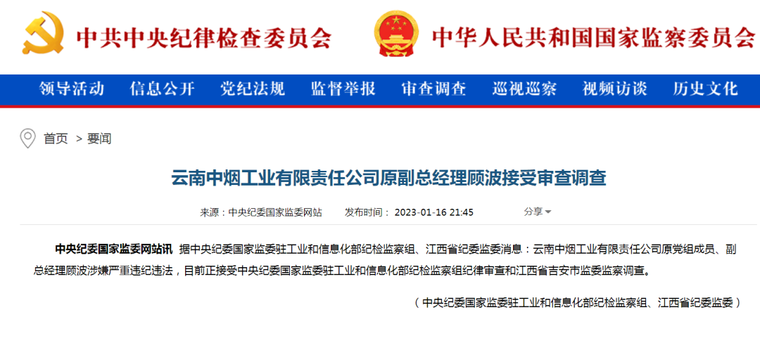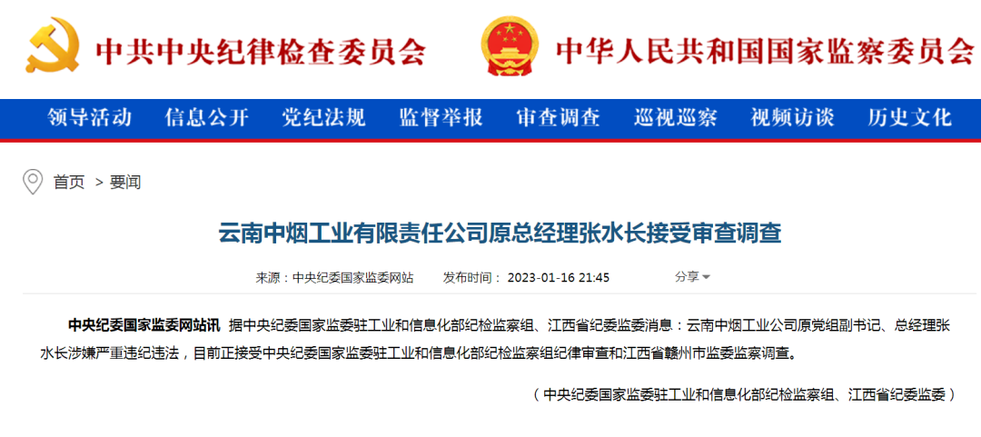 近日,中央纪委国家监委同时通报三名烟草系统高官落马,其中两人属同一家烟草公司的总经理、副总经理,这两人分别是:云南中烟工业有限责任公司原党组副书记、总经理张水长,云南中烟工业有限责任公司原党组成员、副总经理顾波,两人涉嫌严重违纪违法,目前正在接受纪律审查和监察调查。