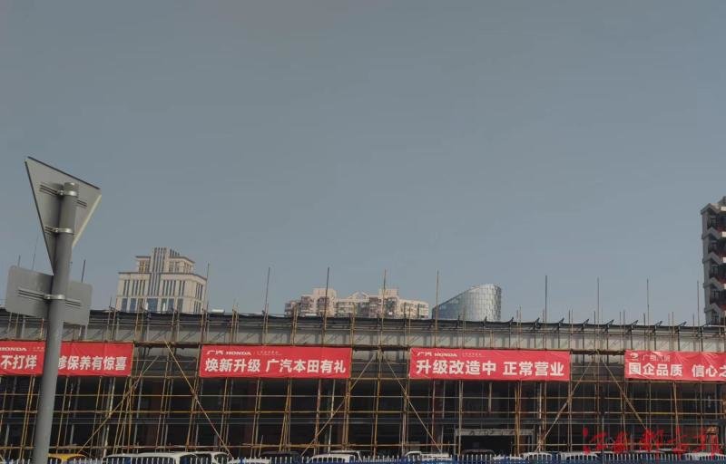 2月16日,记者在现场看到,该4S店已基本建成,外立面搭建有钢架,并悬挂有“升级改造中,正常营业”字样的横幅。采访中,4S店相关负责人对于是否办理相关施工手续,未正面回应。