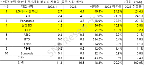 此外,根据SNE research在3月8日公布的2023年1月中国以外的海外市场的电池装车数据,虽然韩国LG新能源以4.1GWh继续排名第一,但排名第二的宁德时代的劣势已经缩小,其电池装车量为4.0GWh,同比增长率67.8%超过了LG新能源的49.8%,市占率24.1%,与LG新能源24.4%只相差0.3个百分点。