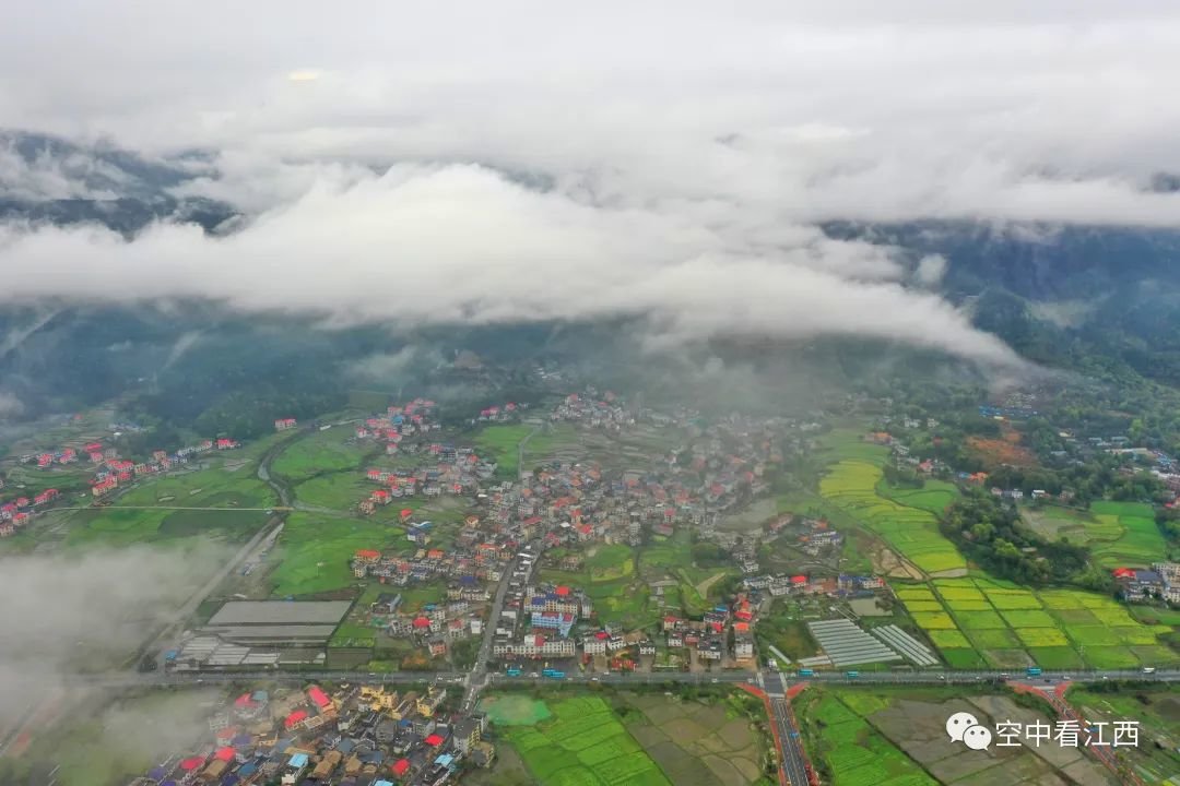 3月23日,航拍江西萍乡芦溪县的田园雨后云雾缭绕,翠绿的稻田,散落的村居、远处的群山共同构成了一幅美丽乡村画卷。许安萍 摄