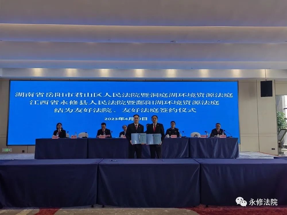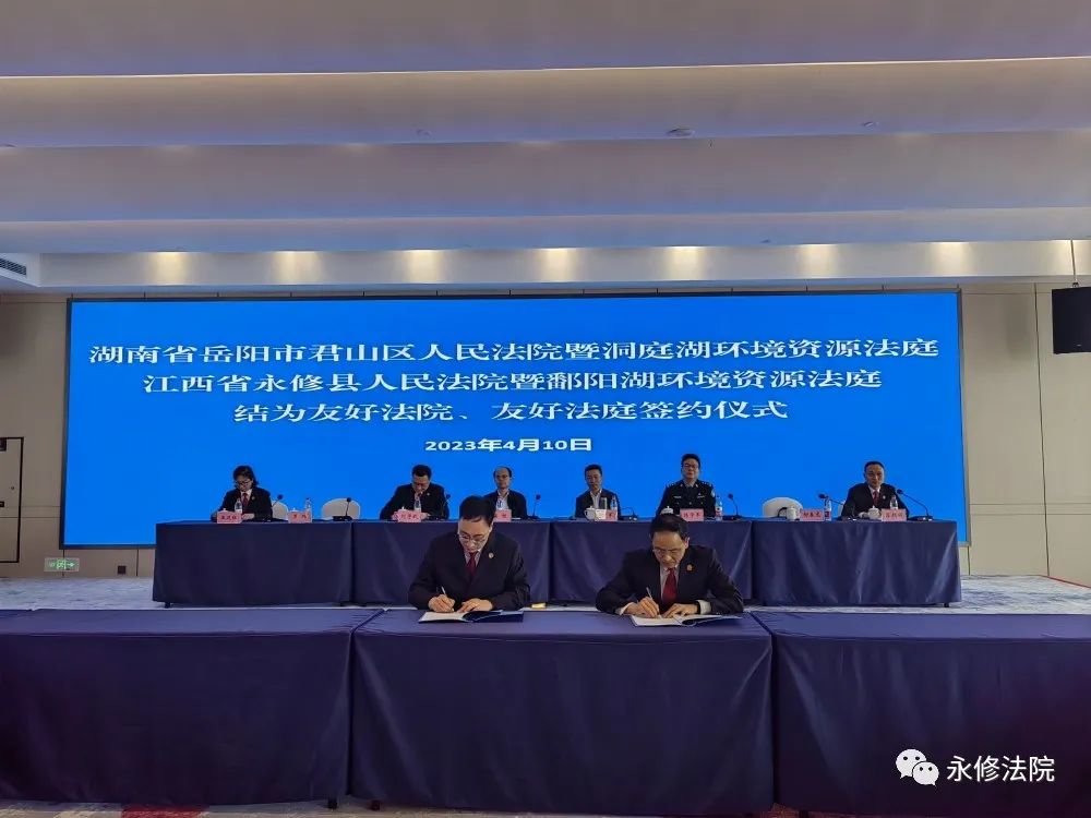 4月10日,永修县人民法院党组书记、院长罗玮带领鄱阳湖环资法庭审判团队赴湖南省岳阳市君山区人民法院调研交流,并与该院洞庭湖环境资源审判庭签署环境资源审判合作协议。