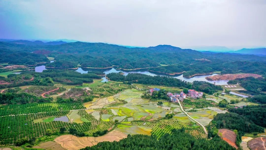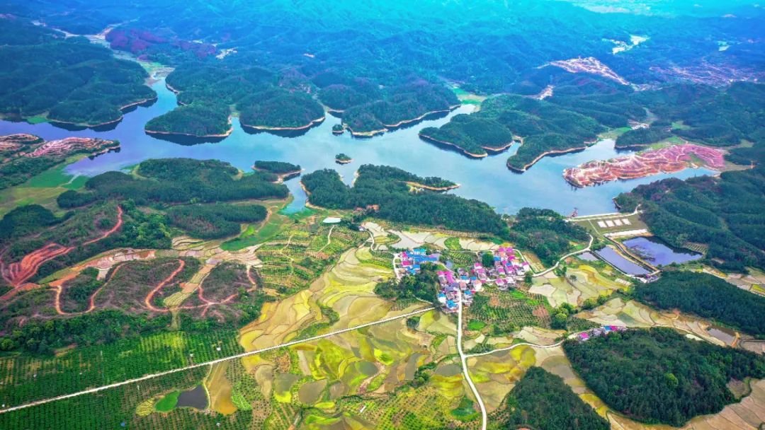 4月20日,俯瞰江西吉安吉水县白水镇院背村,水库、村庄、田园、果园交相辉映,构成了一幅山清水秀、生态宜居的美丽画卷。