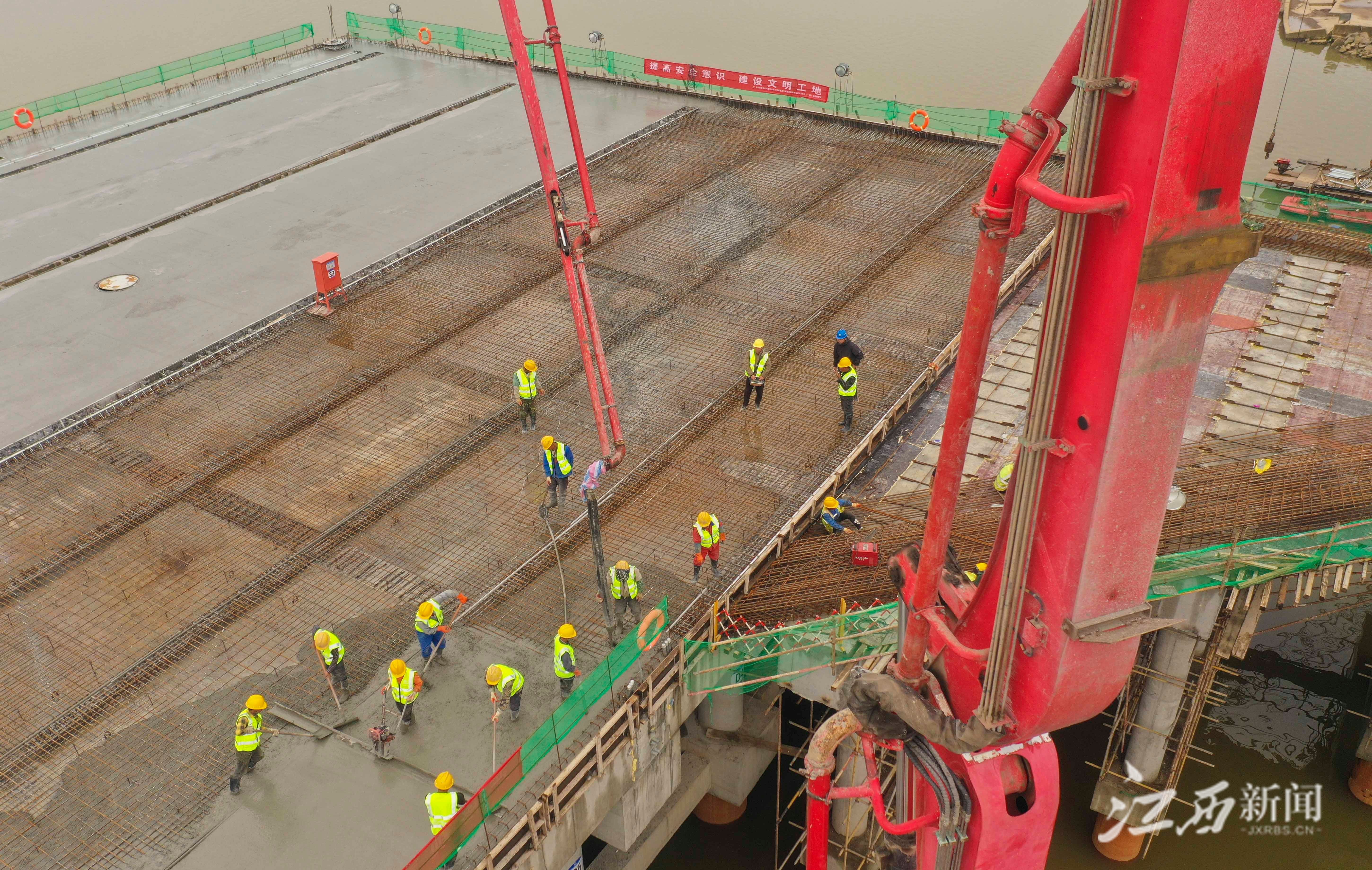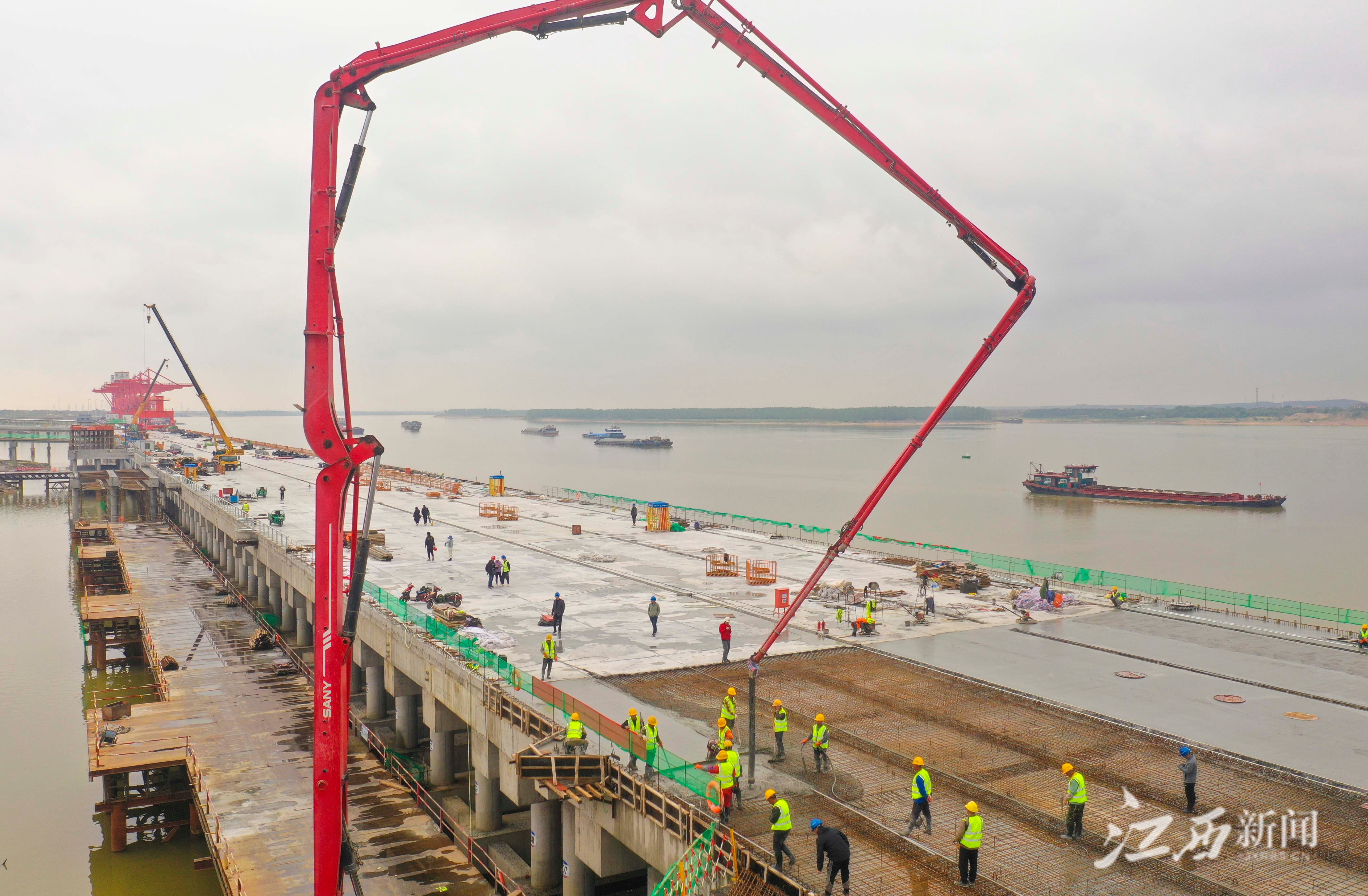 江西新闻客户端讯(江西日报全媒体记者李劼)4月25日,位于南昌县的姚湾综合码头项目建设现场,工人们正在进行码头面层浇筑最后一个分段的施工。随着码头面层浇筑工作的全部完成,标志着该项目16个泊位主体结构工程顺利完工,姚湾码头项目一期泊位主体结构建设步入施工收尾阶段。