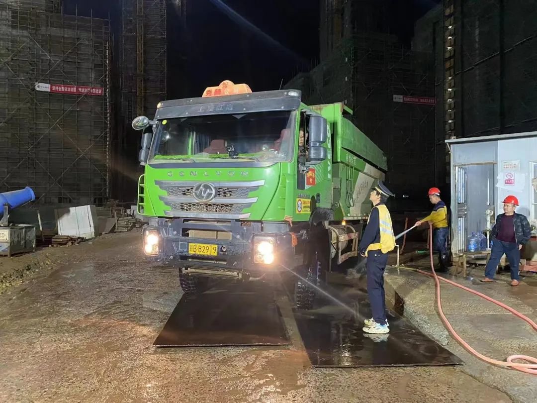 检查工地出入口道路是否存在扬尘污染,施工现场雾炮机、喷淋设备是否正常作业,裸土覆盖是否合规,是否严格落实冲洗作业……执法人员步履不停,从源头密织扬尘治理“防护网”。