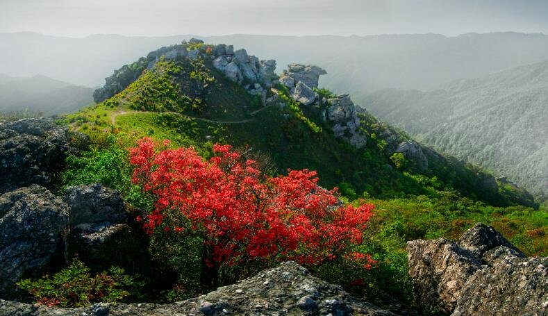 随着气温逐渐回升,近日,永新县台岭乡秋山顶上的映山红争妍绽放,一簇簇、一丛丛,在青山绿树之间竞相辉映,绚丽多彩。(周亚茂、朱国朝、刘平华)