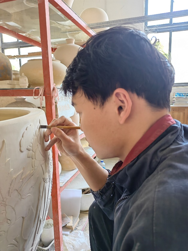 从小跟着父亲做木匠活儿的钟福洪老师,已经成为业界超大型器物雕刻的翘楚。他亲手雕刻的滕王阁、蓬莱仙境、岳阳楼、黄鹤楼等四大名楼屏风,长2.8米、高1.9米,场景恢弘,令人震撼,刻在瓷板上的云朵、花鸟、楼阁丝丝入扣。他用窑变技术制作的达摩祖师像,神态逼真、栩栩如生,颇有曹衣带水的意韵。