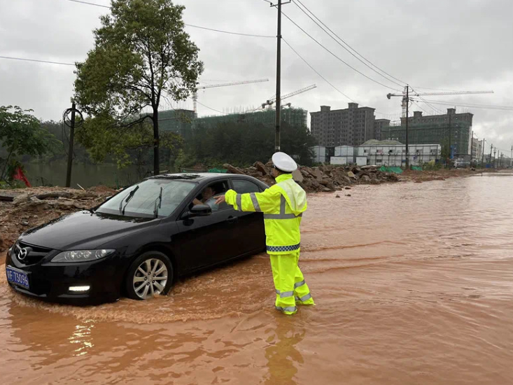 极端天气造成崇仁县县城区主干道出现多处内涝,个别路段积水较深,给车辆和行人带来诸多不便。崇仁县公安局立即启动极端恶劣天气应急预案,闻“汛”而动,疏导交通、救助群众,确保道路安全、有序、畅通,守护群众平安,在暴雨中彰显为民本色 ,在危难时铸造忠诚担当。