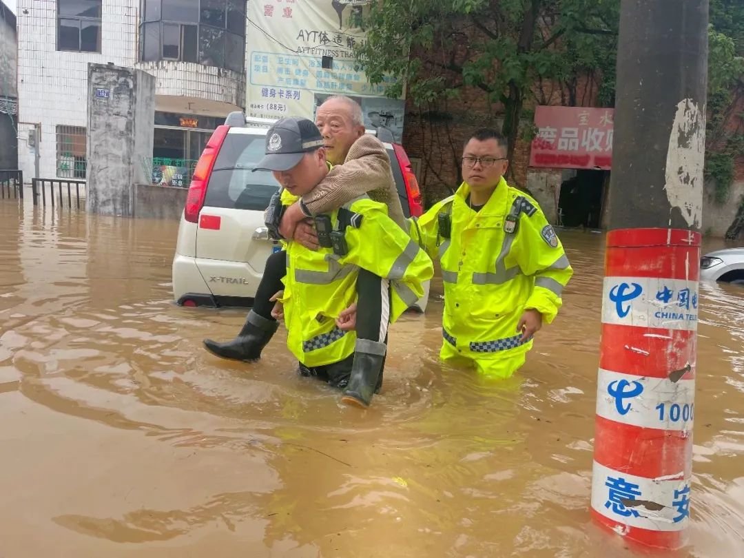 崇仁一名90岁行动不便的老人被困家中,民警蹚水将老人从家里背了出来。