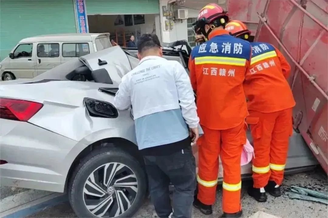车厢尾部压住了一辆白色小车