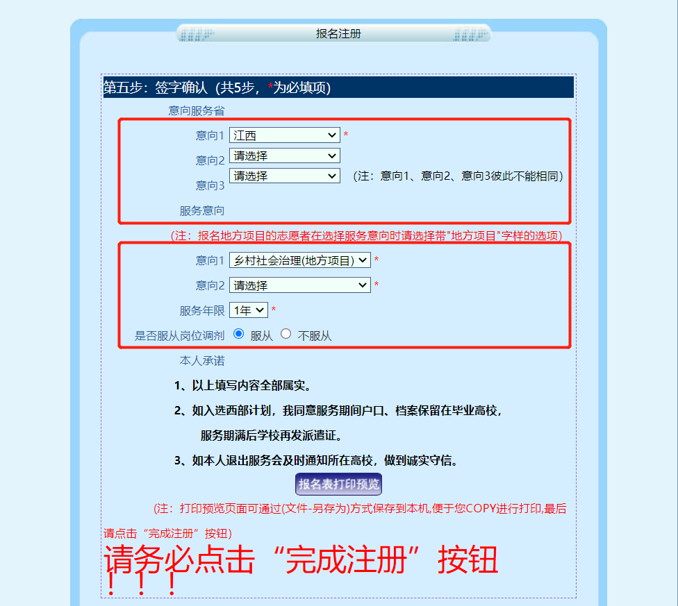 “意向服务省一”、或“意向服务省二”、”意向服务省三”选择江西,“服务意向”岗位专项选择带有“地方项目”字样的岗位。 填写完成后,点击 “ 报名表打印预览” 按钮。