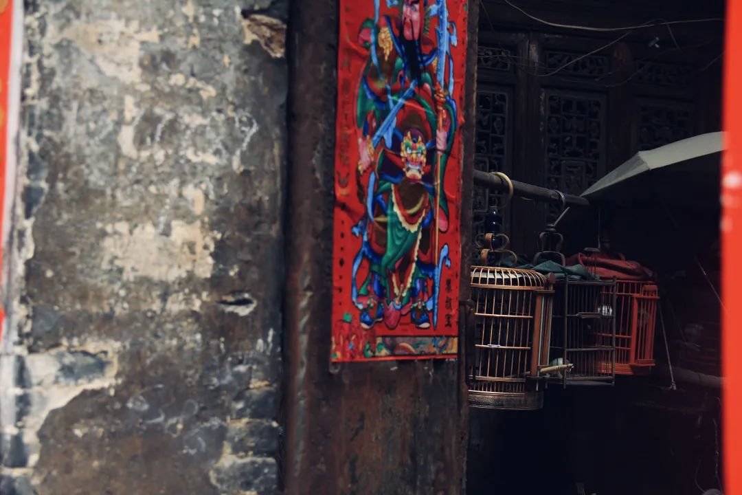 记者随着白光华的脚步,又来到另一户人家。大门敞开着,厅堂的一角挂着一排木质鸟笼,鸟儿叽叽喳喳,颇具生气,加上其后的缠枝纹格窗作背景,气氛古朴。