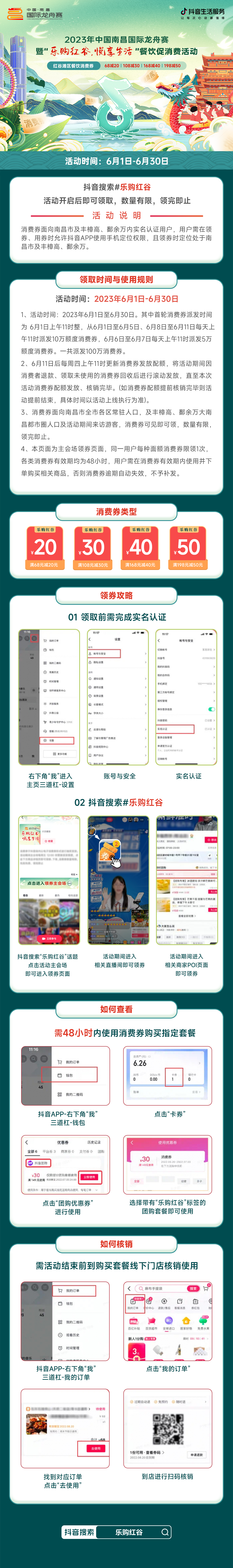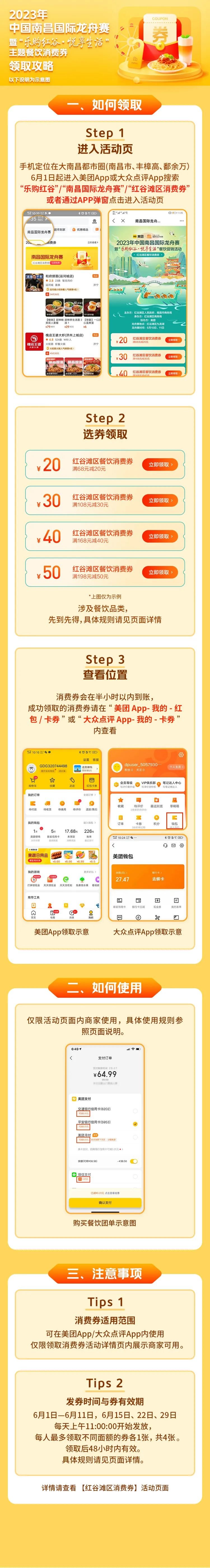 6月1日-6月11日,6月15日、22日、29日上午十一点,定位在南昌市、丰樟高、鄱余万地区的市民均可打开美团App或大众点评APP,搜索“乐购红谷”“南昌国际龙舟赛”“红谷滩区消费券”或通过弹窗进入活动页面领取餐饮电子消费券,同一用户每类消费券限领一张,数量有限,先到先得。