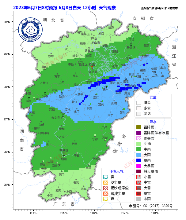 6时39分,南昌市气象台继续发布暴雨黄色预警信号:预计未来6小时内,南昌市局部地区降水可达50毫米以上,局地伴有短时强降水、雷电等强对流天气,请注意防范强降雨可能引发的城乡内涝和地质灾害。