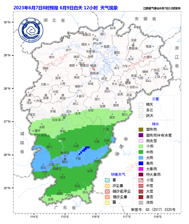 明天(6月9日),赣中南部和赣南阴有中雨或雷雨,局部地区有大到暴雨;赣中北部多云,局部地区有阵雨,赣北多云间晴。