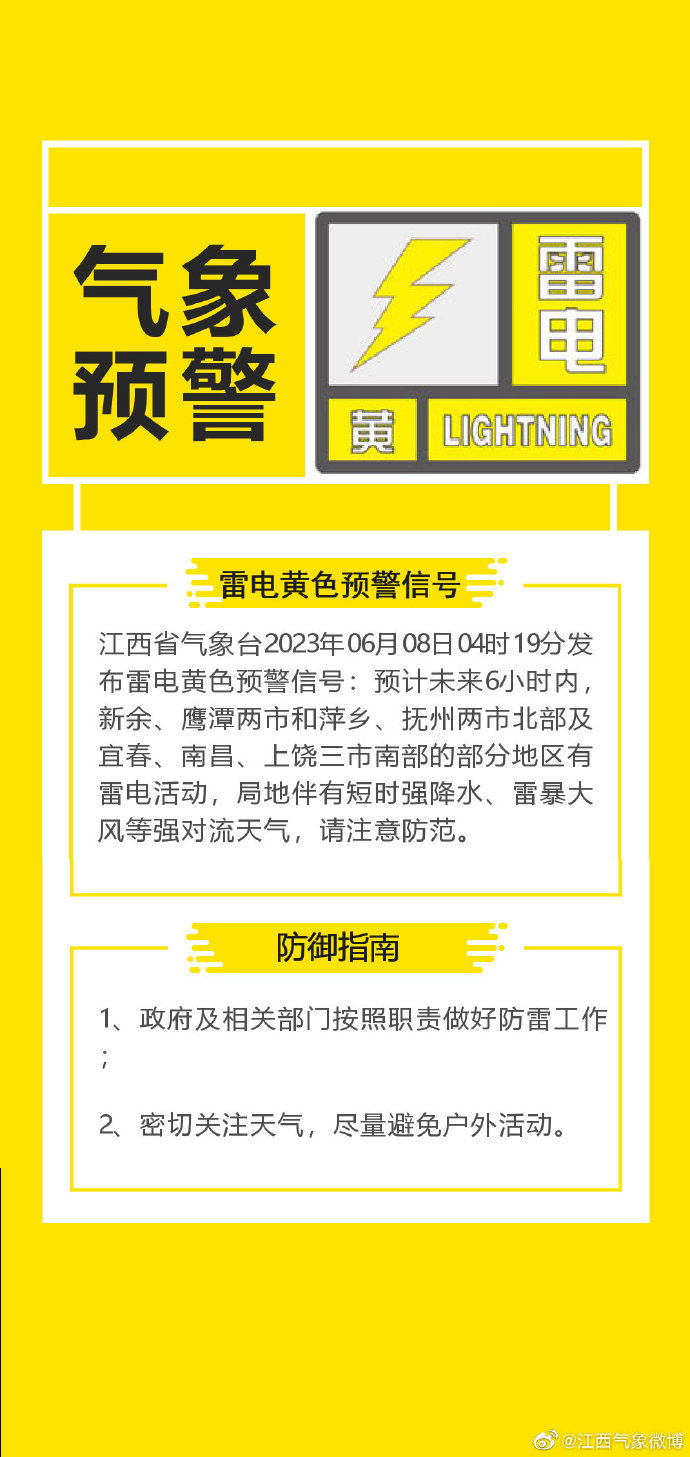 6月8日6时35分,南昌市气象台发布雷电黄色预警信号:预计未来6小时内,南昌市部分地区将有雷电活动,局地伴有短时强降水、雷暴大风等强对流天气。