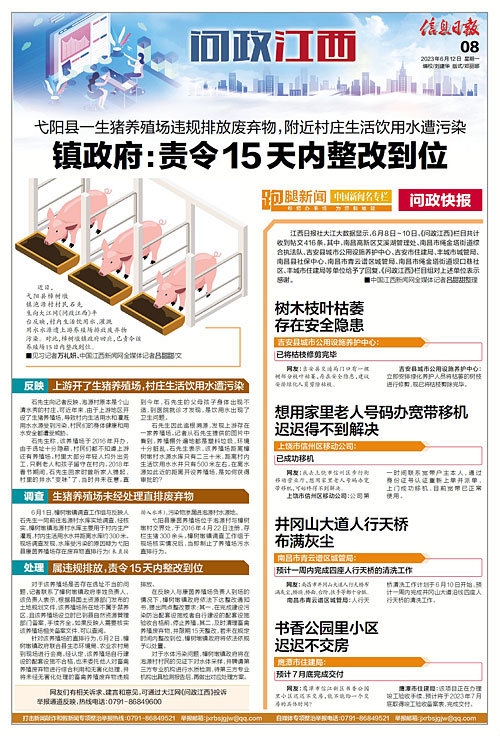 近日,弋阳县樟树墩镇泡源村村民石先生向大江网《问政江西》平台反映,村内生活饮用水、灌溉用水水源遭上游养殖场排放废弃物污染。对此,樟树墩镇政府回应,已责令该养殖场15日内整改到位。