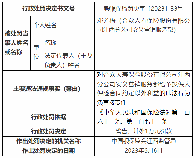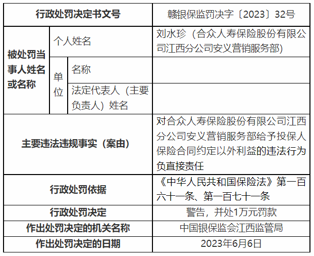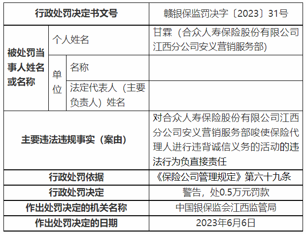 因对合众人寿江西分公司安义营销服务部相关违法行为负直接责任,甘霖(合众人寿保险股份有限公司江西分公司安义营销服务部)被处以警告、罚款0.5万元的行政处罚,刘水珍(合众人寿保险股份有限公司江西分公司安义营销服务部)被处以警告、罚款1万元的行政处罚,邓芳梅(合众人寿保险股份有限公司江西分公司安义营销服务部)被处以警告、罚款1万元的行政处罚。(尹谱圣)