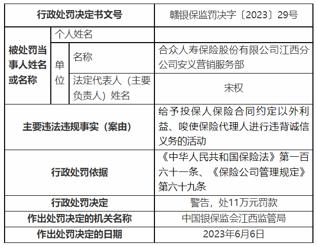 第29号行政处罚信息公开表显示,合众人寿江西分公司安义营销服务部因存在“给予投保人保险合同约定以外利益、唆使保险代理人进行违背诚信义务的活动”等违法违规事实,中国银保监会江西监管局依据《中华人民共和国保险法》第一百六十一条、《保险公司管理规定》第六十九条,对其作出警告、罚款11万元的行政处罚决定。