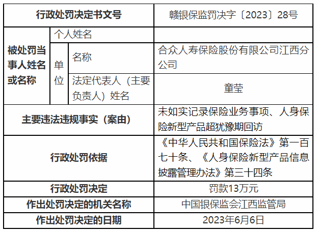 第28号行政处罚信息公开表显示,合众人寿江西分公司因存在“未如实记录保险业务事项、人身保险新型产品超犹豫期回访”等违法违规事实,中国银保监会江西监管局依据《中华人民共和国保险法》第一百七十条、《人身保险新型产品信息披露管理办法》第三十四条,对其作出罚款13万元的行政处罚决定。
