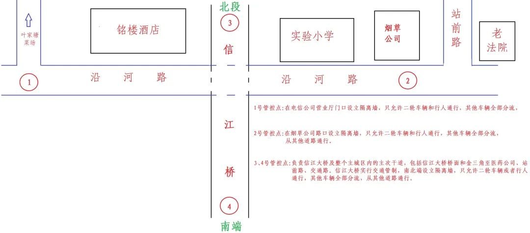 (一)沿河路大南门至烟草公司路段,分别在电信公司营业厅门口和烟草公司路口设立隔离墙,只允许二轮车辆和行人通行,其他车辆请绕道通行。