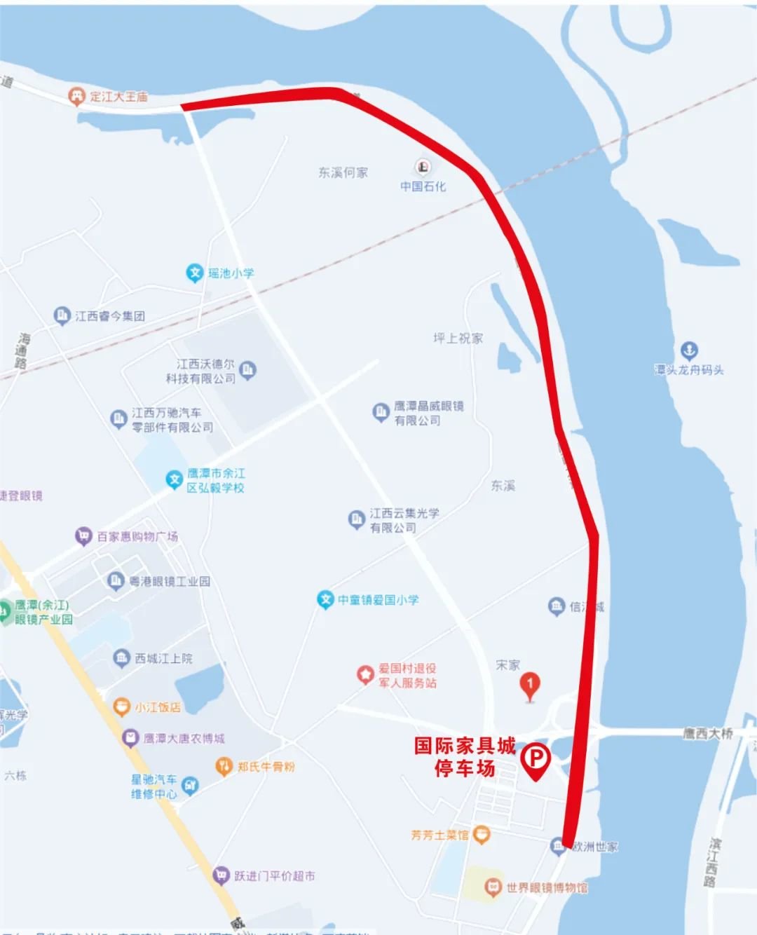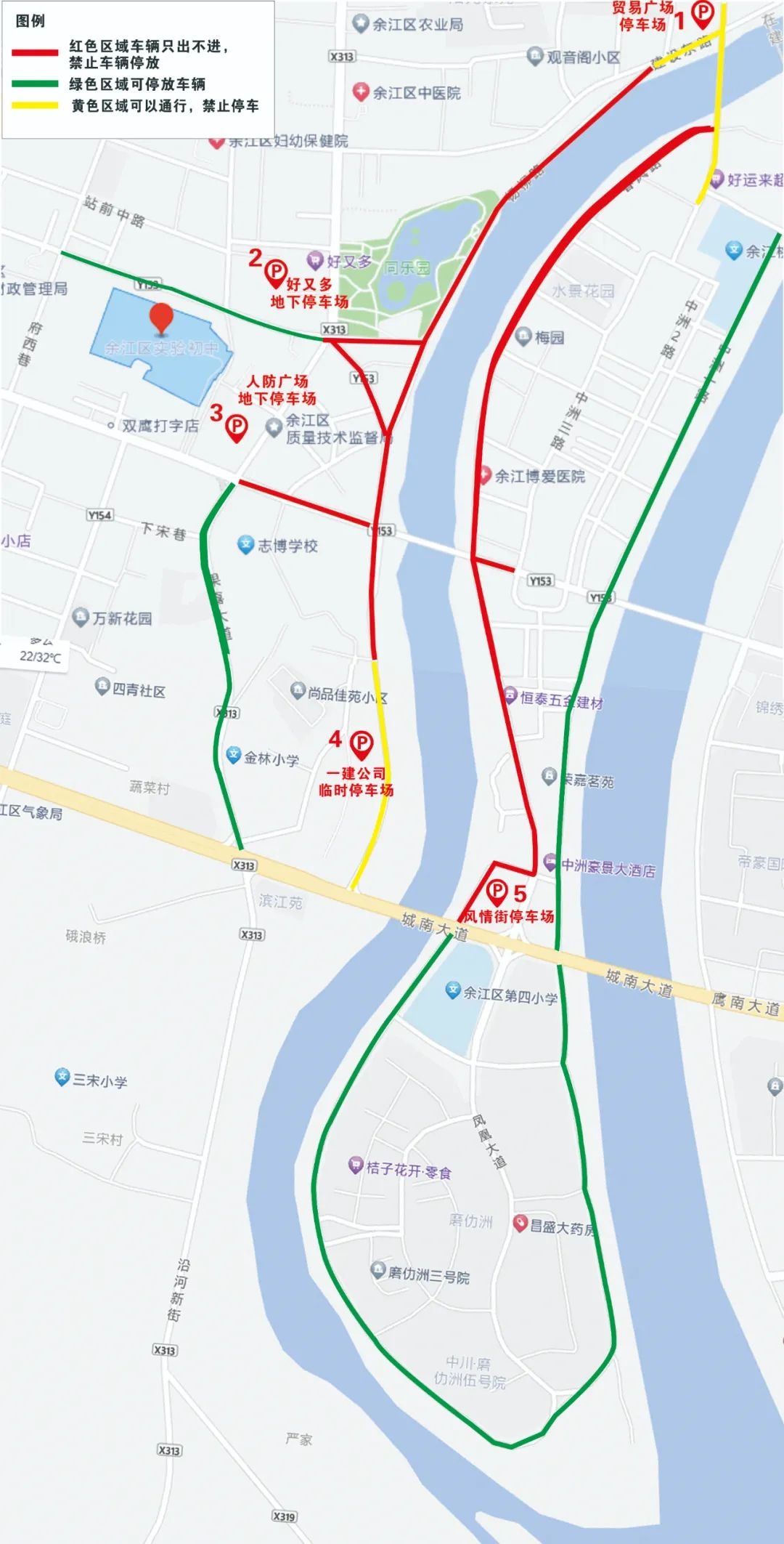 邓埠城区红色划线管制路段汽车(含三轮车)只出不进,管制区内禁止车辆停放。 观音阁大桥周围、沿河南路尚品佳苑至城南大道黄色划线路段可以通行,禁止停车。广场路、果喜大道、中洲一路绿色划线路段,社会车辆可以在路边停车位停放。果喜大道人防广场停车场、好又多地下停车场、余江农贸市场停车场、一建公司临时停车场、风情街停车场由北至南设为1、2、3、4、5号停车点,社会车辆可在此停放。