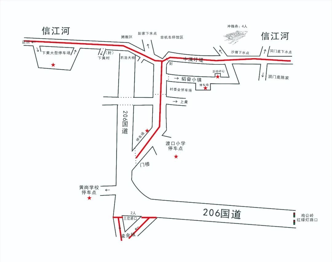 管制路段禁止大中小型客车、货车进入,中潢圩堤路面禁止停车,渡口下黄村、渡口小学、文武学校设有临时停车场。