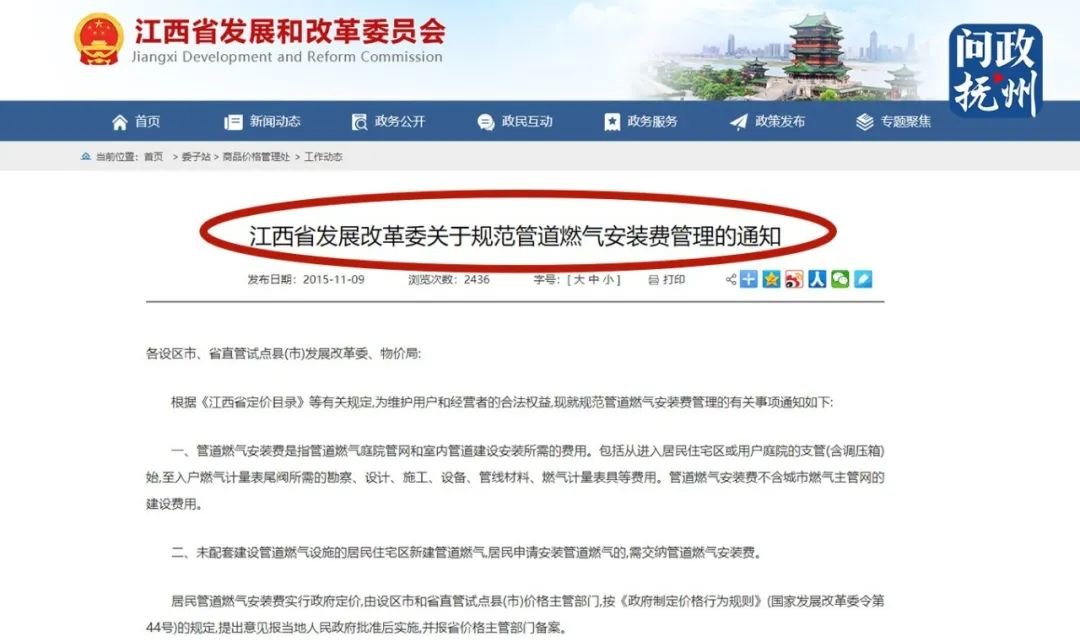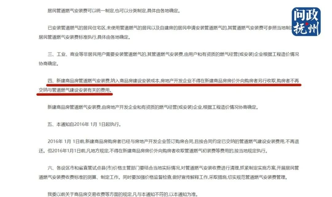 就此事,记者登录省发改委官网查询发现,2015年11月9日,省发改委下发《江西省发展改革委关于规范管道燃气安装费管理的通知》,通知规定,新建商品房管道燃气安装费,纳入商品房建设安装成本,房地产开发企业不得在新建商品房房价外向购房者另行收取,购房者不再交纳与管道燃气建设安装有关的费用,通知自2016年1月1日起执行。据陈先生介绍,2019年以来,他先后就此事找了开发商抚州市昌鹰实业有限公司三四次,但一直未得到答复。