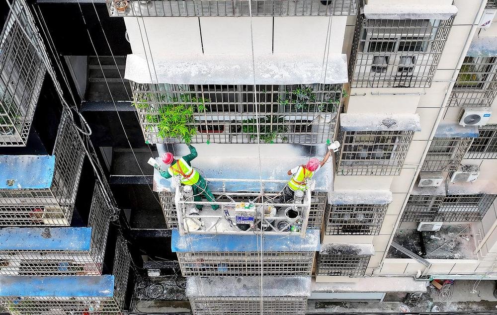 6月28日,施工人员在宜丰县耶溪社区商务老旧小区进行外立面改造作业。近年来,该县持续提升老旧小区改造工作效能,通过实施外立面改造、墙体防水改造、道路改造、管网改造等工程,让老旧小区旧貌换新颜,居民的居住条件和生活品质得到有效提升。