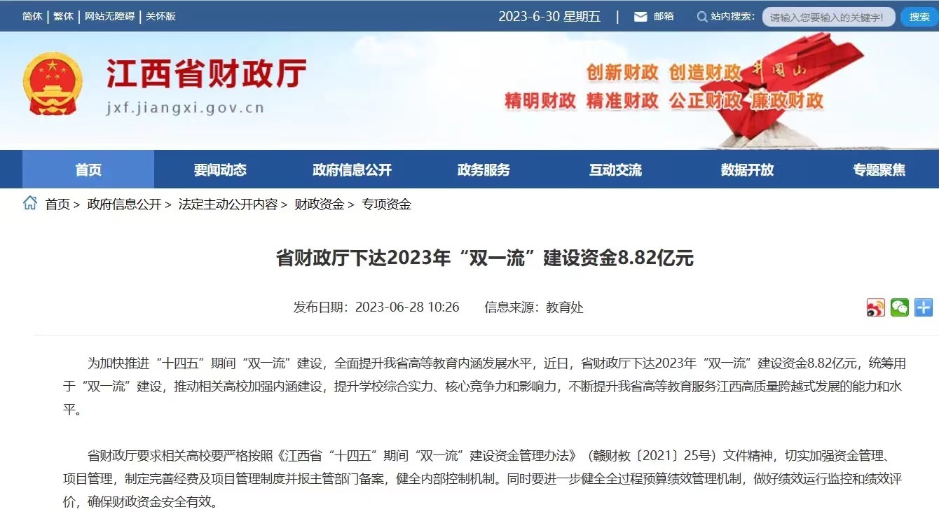 大江网/大江新闻客户端讯 江西日报全媒体记者殷琪惠 实习生刘贝贝报道:7月3日,记者从省财政厅了解到,为加快推进“十四五”期间“双一流”建设,全面提升高等教育内涵发展水平,我省下达2023年“双一流”建设资金8.82亿元,统筹用于“双一流”建设,推动相关高校加强内涵建设,提升学校综合实力、核心竞争力和影响力,不断提升我省高等教育服务的能力和水平。
