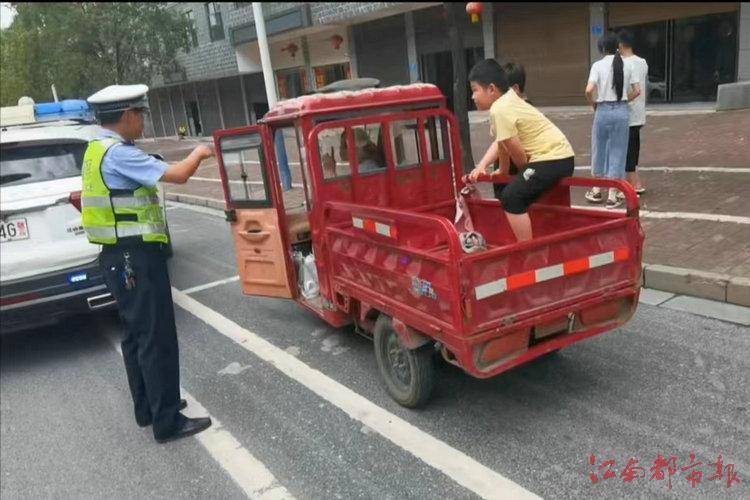江南都市报讯 黄招娣、钟春燕、全媒体记者刘健摄影报道:当前正值学生放暑假,假期安全不放假。7月5日,分宜交警双林中队在街头执勤巡逻时,发现一辆电动三轮车的车斗里蹲着几名学生,民警当即将车拦停,将孩子们抱下车,并对驾驶人进行安全教育。