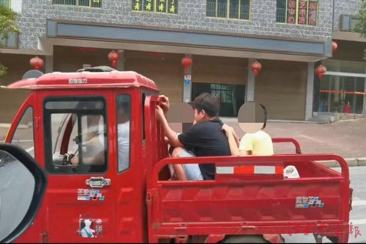 7月5日,分宜县交警双林中队在辖区双林美食街附近执勤巡逻时,远远发现一辆电动三轮车车后斗里蹲着几名学生,现场一幕让交警捏了一把汗。于是立即示意三轮车驾驶人靠边停车接受检查。经清点,除了车后斗内3名学生,驾驶室还挤了一名学生。询问得知,孩子们暑假吵闹着要去走亲戚,想着没多远,家长就用三轮载着他们一起去。