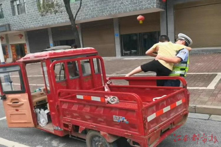 民警把孩子抱下车的同时,坚持把宣传工作融入执法管理中。告知驾驶人三轮车载人既违法又危险,使驾驶人认识到自己违法行为的危害性。
