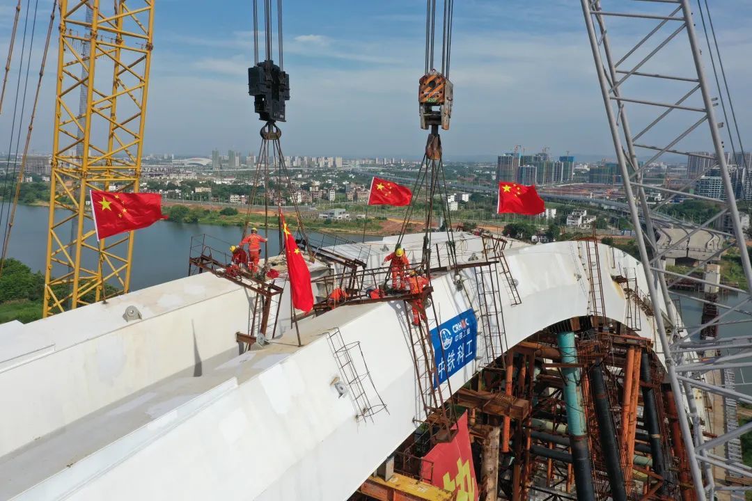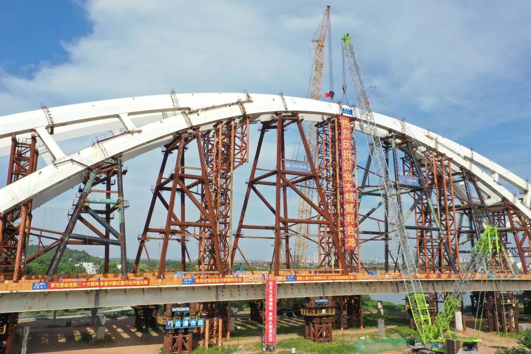 7月10日5点半左右,在24名工人及2台500吨履带吊车等人员机械的有序配合下,经过近1小时的紧张施工,赣州蓉江新区创业大桥完成最后一节钢结构拱肋吊装,标志着创业大桥主副拱顺利合龙。至此,该项目已完成总工程量的89.5%。