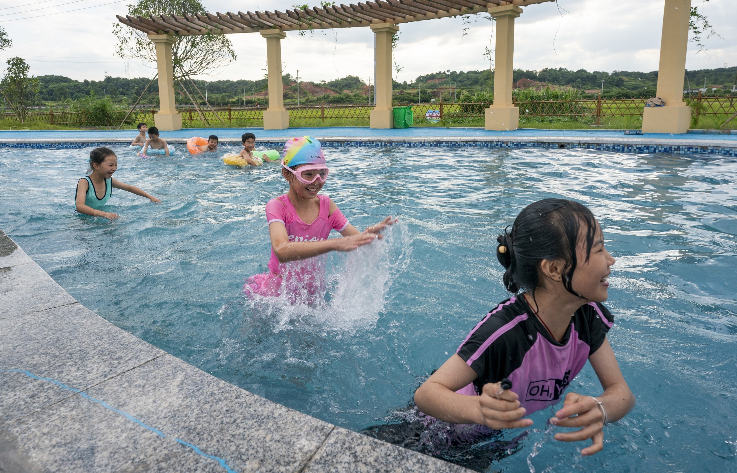 7月7日,仙女湖区河下镇平川村乡村游泳池内,孩子们在村干部、家长陪护下戏水消暑。小暑时节,孩子们在当地新农村配套建设的游泳池内消暑纳凉,并以此加强乡村孩子游泳培训,做好防溺水宣传等。