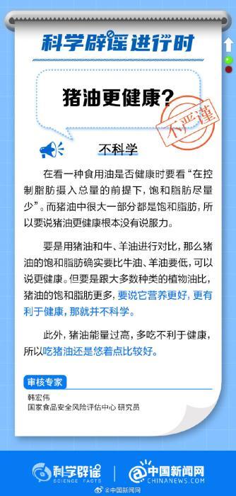 中新网7月13日电 多吃猪油利于健康吗?事实上,在看一种食用油是否健康时,要看“在控制脂肪摄入总量的前提下,饱和脂肪尽量少”。那么猪油的饱和脂肪含量如何?了解真相↓(来源:科学辟谣、中国新闻网微博)