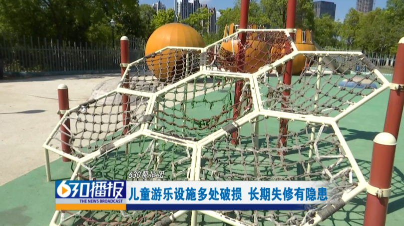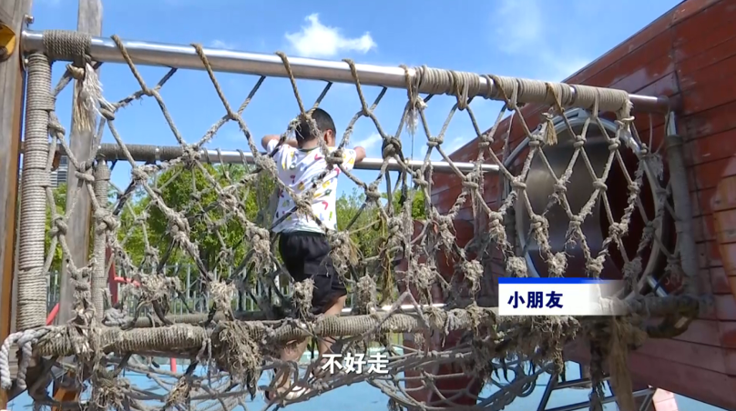 记者在城市中央公园的儿童游乐场发现,有非常多的设施存在损坏的问题。不少网绳底部断裂破洞很大,导致孩子在攀爬或行走时,脚非常容易踏空,存在卡脚或跌落的危险。