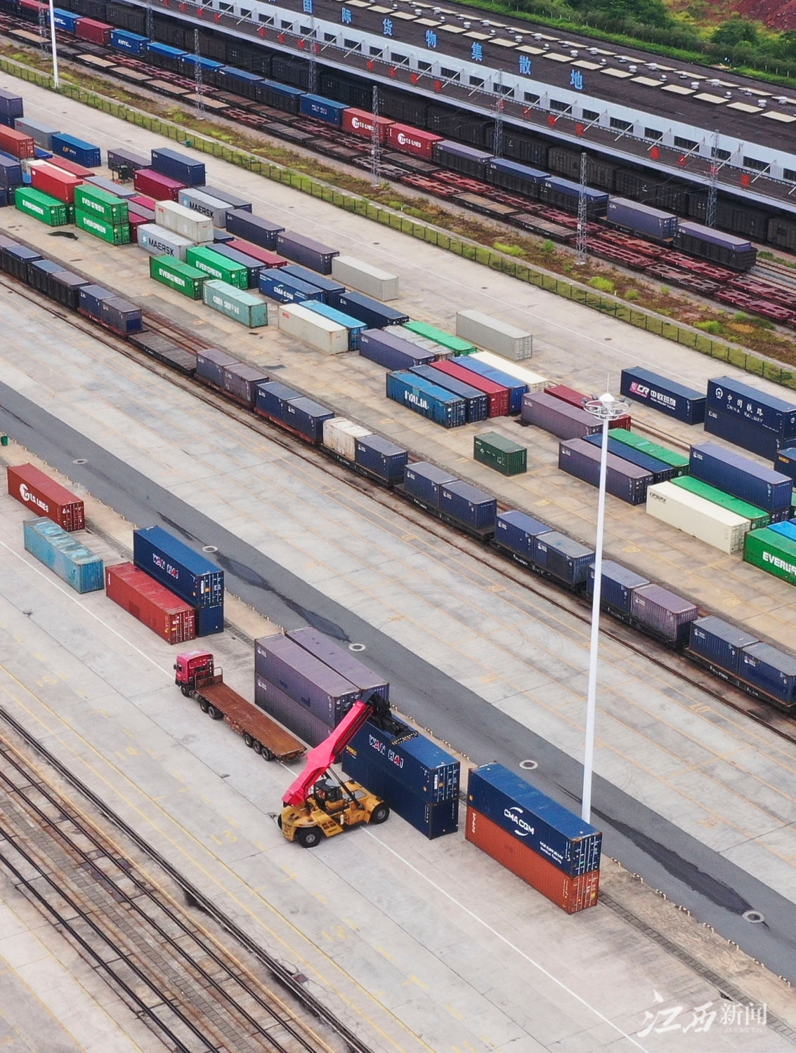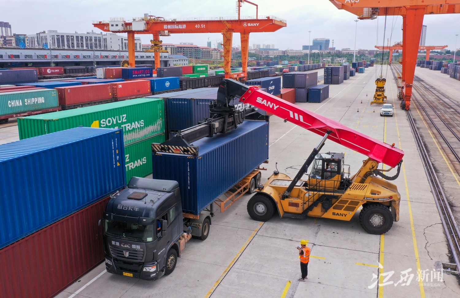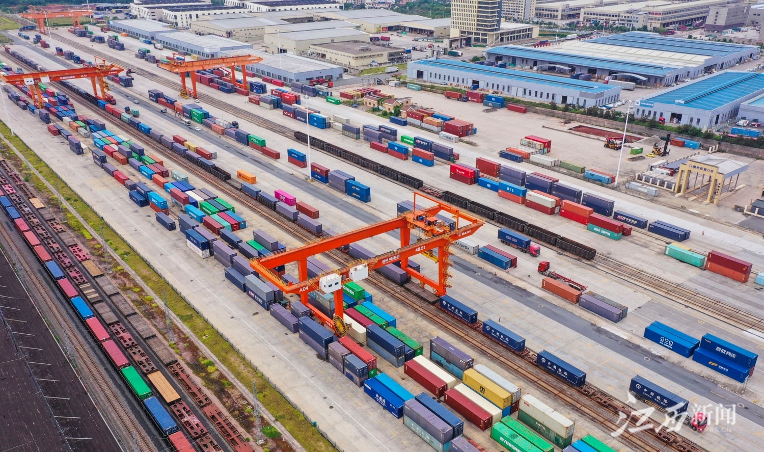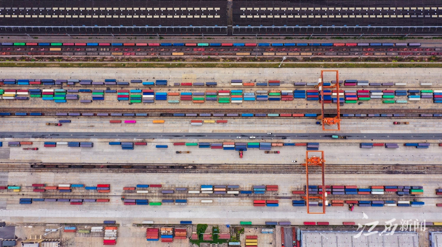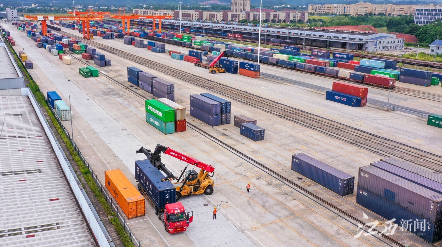 江西新闻客户端讯(江西日报全媒体记者史港泽)7月18日,位于赣州市南康区的赣州国际陆港,大型龙门吊正在吊装集装箱,货车往来穿梭,一派繁忙景象。据统计,2023年上半年,赣州国际陆港累计开行铁海联运“三同”班列920列,同比增长18.86%;铁路集装箱吞吐量12.37万标箱,同比增长21.66%,均创历史新高。