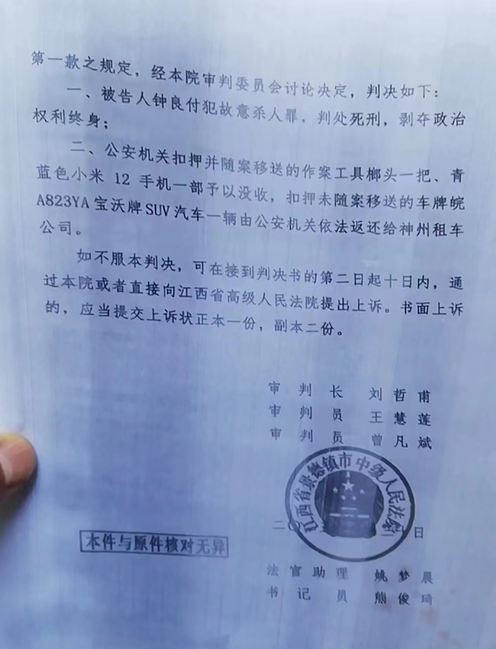 2023年6月30日,景德镇市中院作出一审判决,以故意杀人罪判处钟良付死刑,剥夺政治权利终身;作案工具榔头一把、手机一部予以没收。