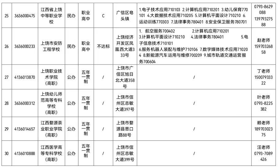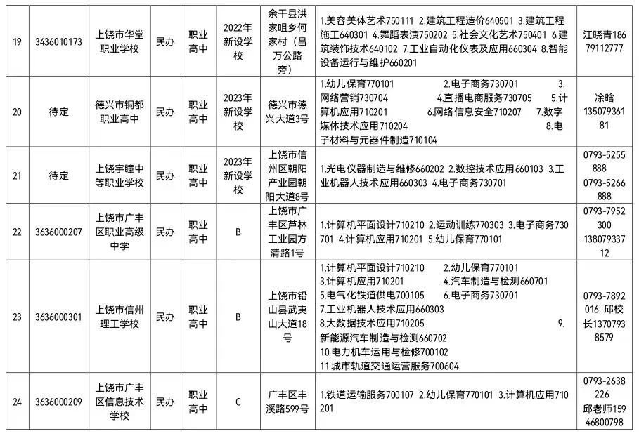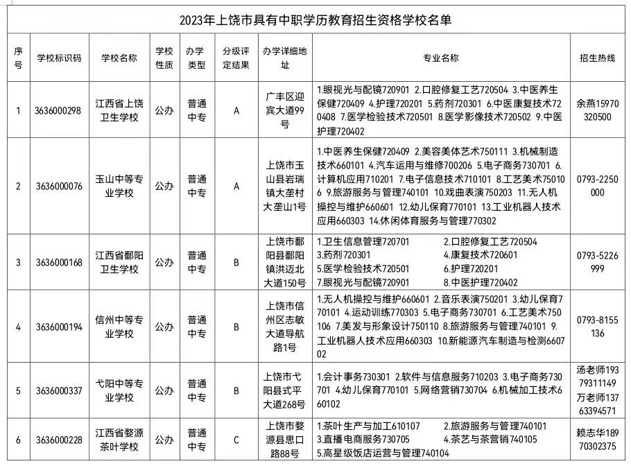 根据省教育厅 省人社厅《关于公布2023年具有中等职业教育招生资格学校名单的通知》(赣教职成字〔2023〕13号)文件精神,2023年上饶市教育系统具备中职学历教育招生资格学校30所,其中中职学校26所(公办普通中专11所和职业高中4所、民办职业高中11所,均为全日制学历教育学校,具备颁发全日制中职学历证书资格),高职院校(五年一贯制)4所。现就有关要求通知如下: