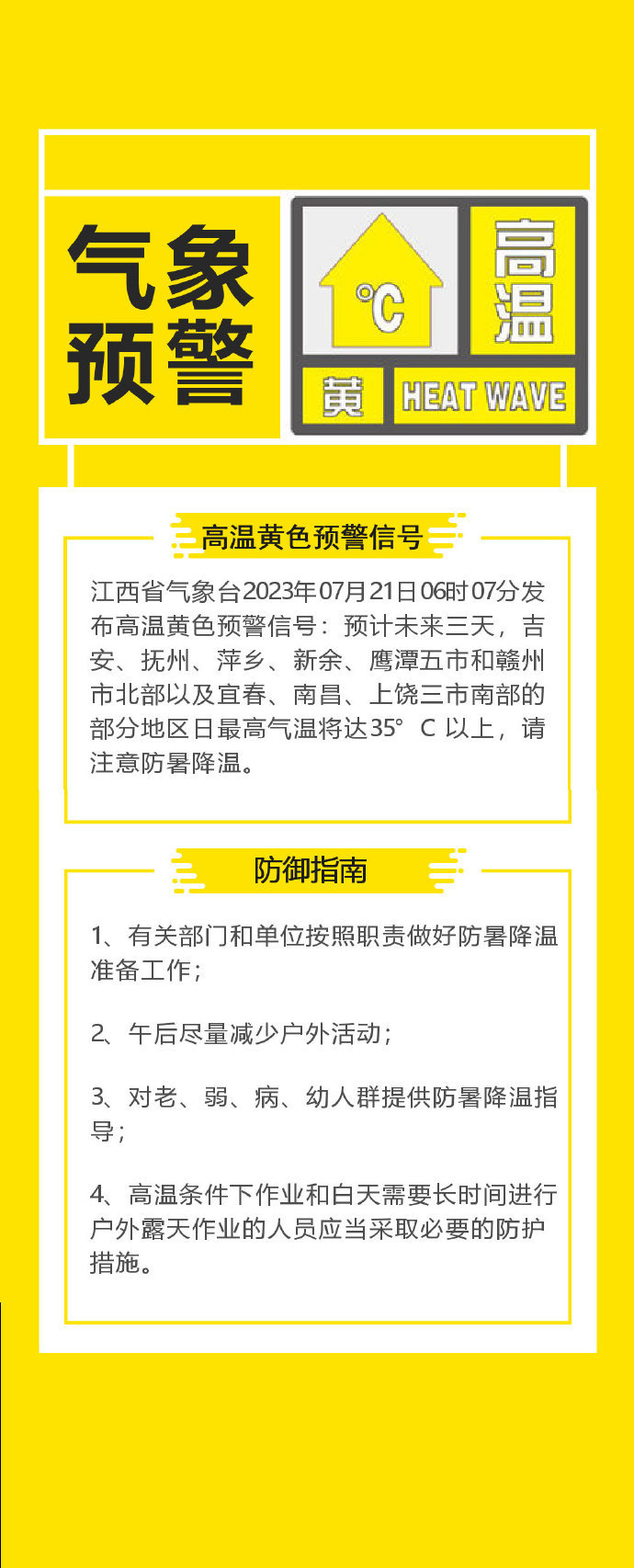 江西新闻客户端讯(全媒体记者孙沐雨)江西省气象台2023年7月21日6时7分发布高温黄色预警信号:预计未来三天,吉安、抚州、萍乡、新余、鹰潭五市和赣州市北部以及宜春、南昌、上饶三市南部的部分地区日最高气温将达35°C以上,请注意防暑降温。