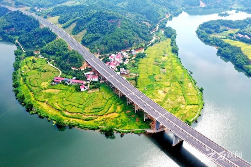 7月22日,全南县龙下乡,来往车辆在大广高速复线南龙段飞驰,高速公路与沿线的田园、乡村、山川等相映成景,美如画卷。通讯员 尹其奇摄