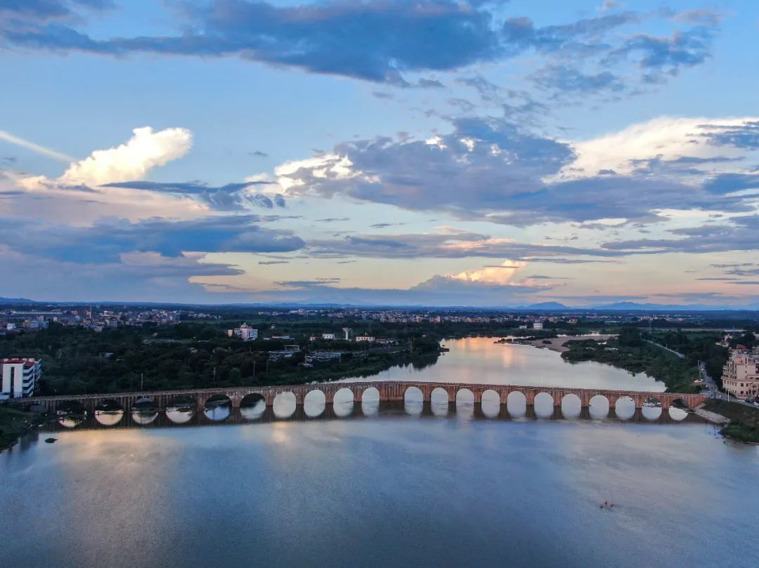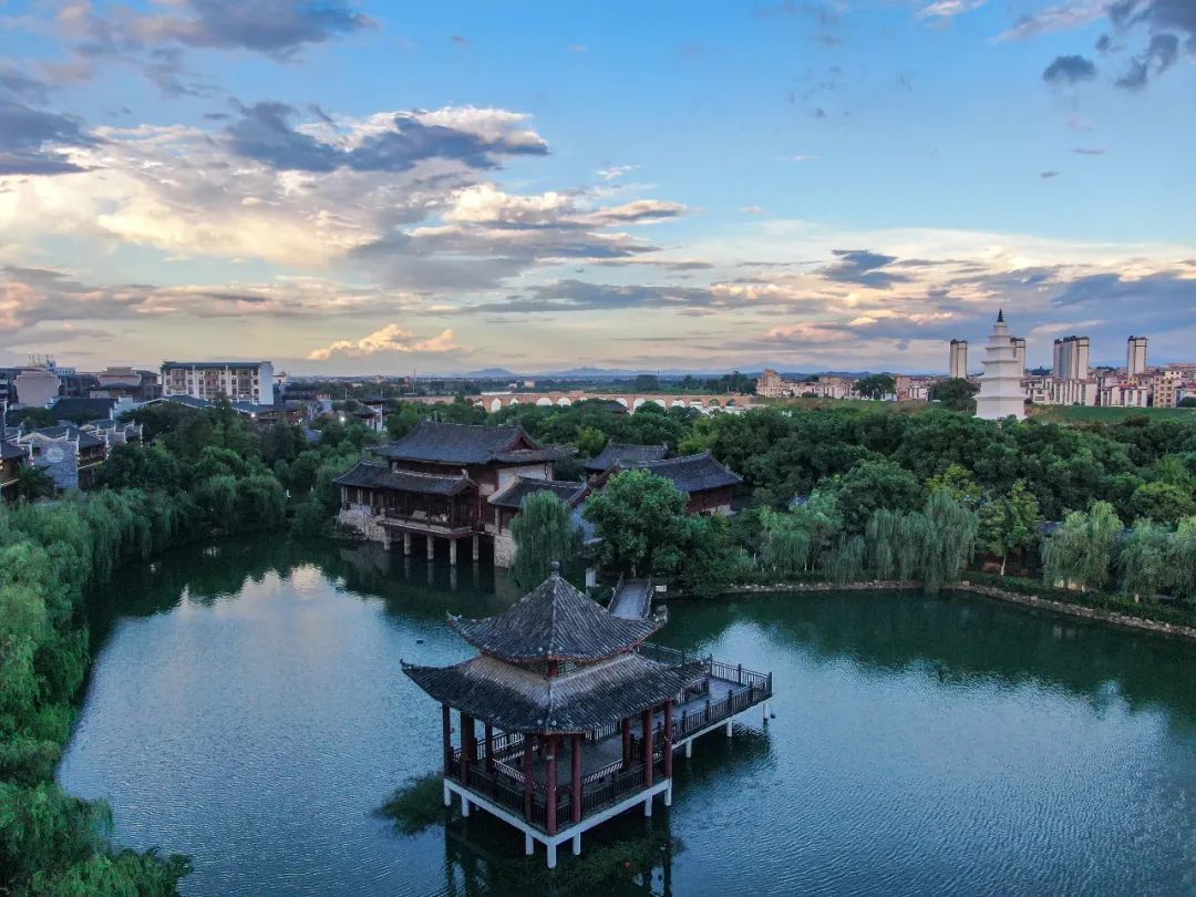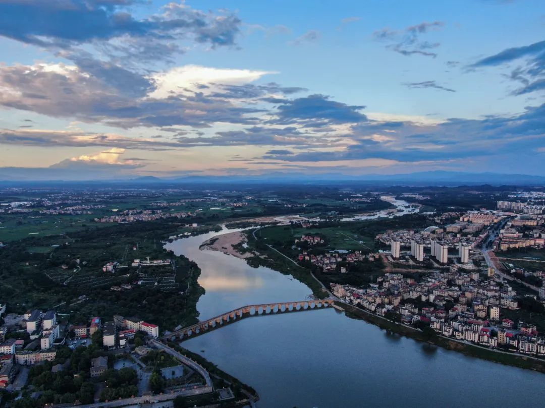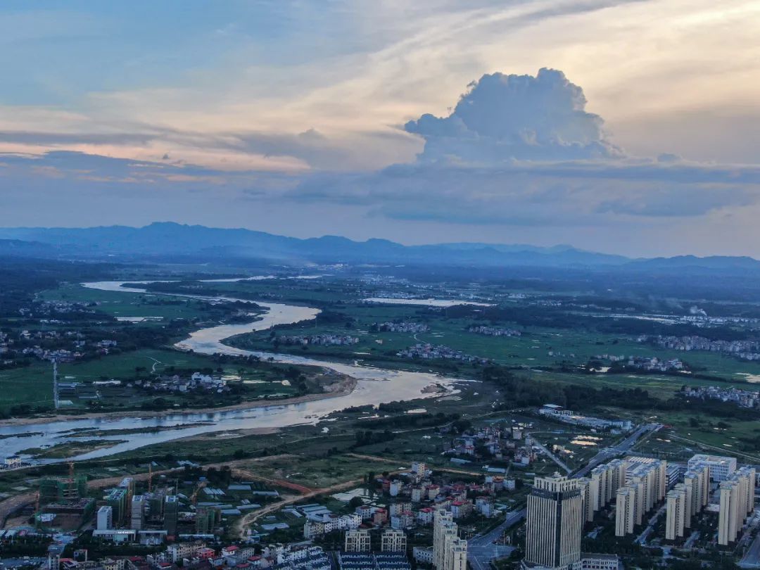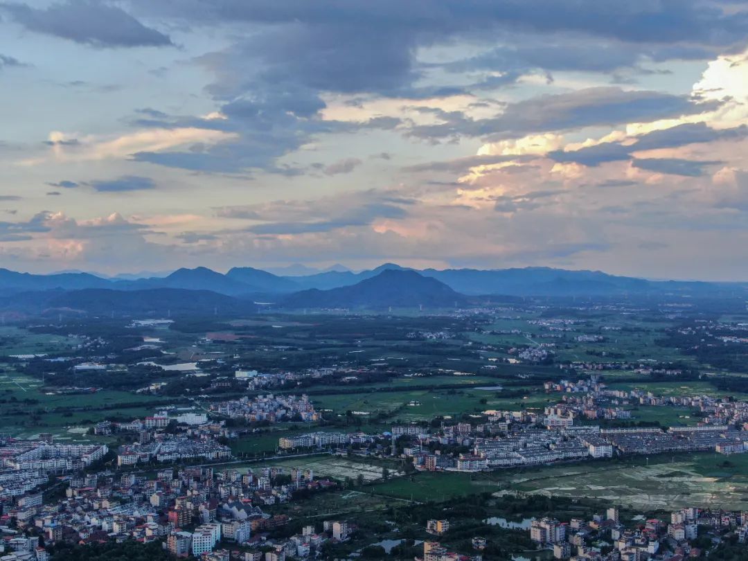 7月27日,黄昏时分,航拍江西吉安永丰县,只见天空之中云朵变幻莫测,金色晚霞染黄了天边,小城山环水绕,农田连片,宛若一幅静谧田园画卷。