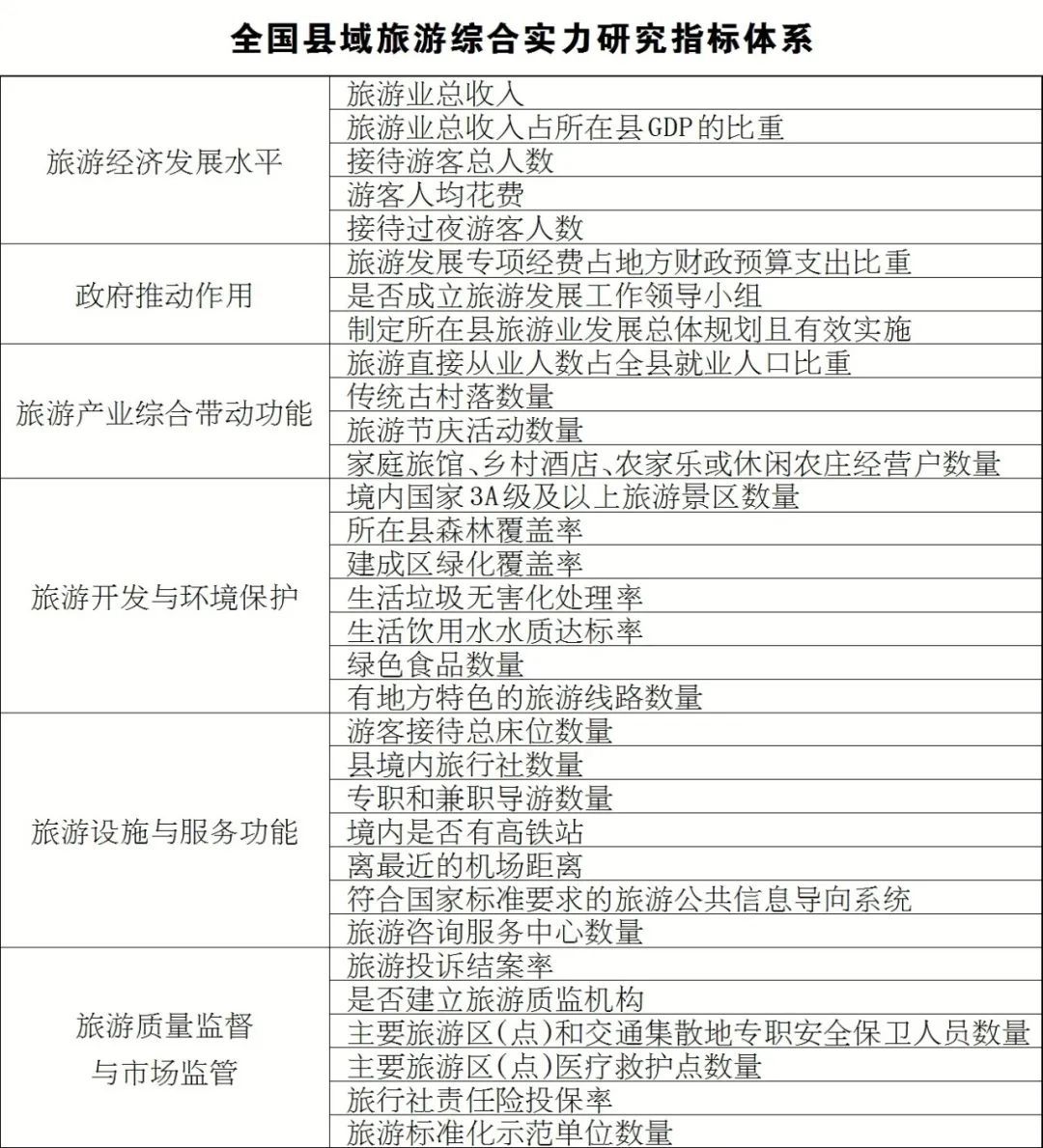 报告显示,县域旅游综合实力研究从旅游经济发展水平、政府推动作用、旅游产业综合带动功能、旅游开发与环境保护、旅游设施与服务功能、旅游质量监督与市场监管6个方面32个指标构建研究体系,得分居前100位的即为2023年全国县域旅游综合实力百强县。详细指标如下: