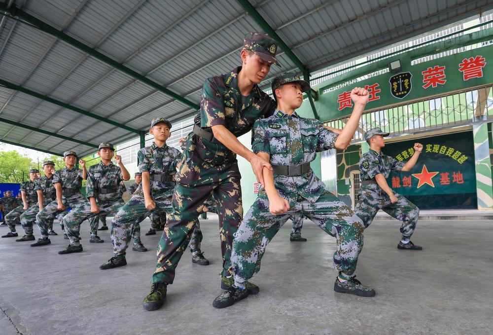 8月1日,在丰城市龙剑基地军事训练场内,参加军事夏令营的学员在教官的指导下进行军事训练。