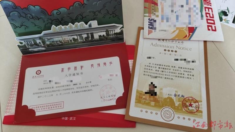 小杨是南昌一名高考生,今年高考填报了成都艺术职业大学。通过2023年江西省普通高等学校招生全国统一考试成绩及录取查询结果平台,他查询到自己已被成都艺术职业大学数字媒体艺术专业录取。就在他等待接收录取通知书之时,几乎同一时间,他竟然收到了两份通知书,除了报考的成都艺术职业大学的录取通知书,他还收到了武汉工商学院的入学通知书。
