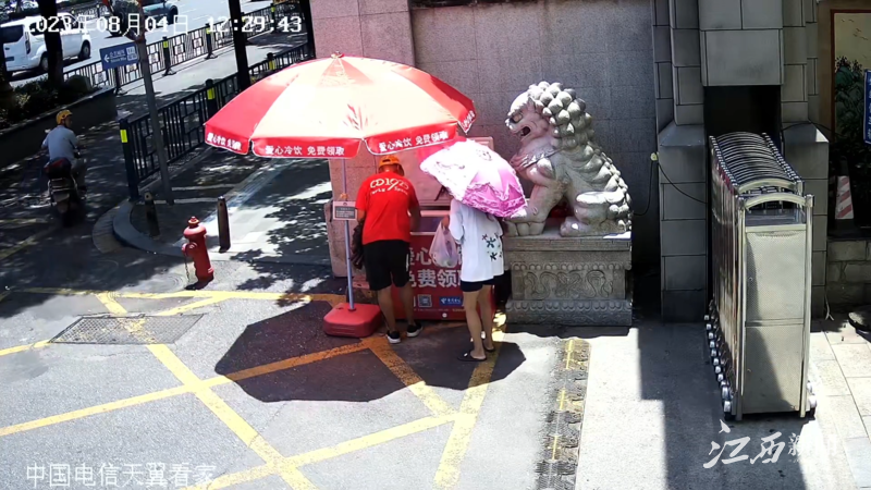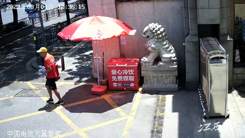 就在昨天(8月4日)12时29分,一对男女径直走到爱心冰柜前,女子直接拿出塑料袋一瓶又一瓶地开装,男子手上也拿了两三瓶,然后两人离开。约5分钟后,男子又再次返回,这次一下抱走十多瓶水,仿佛来这进货的,看这架势不像第一回光顾。