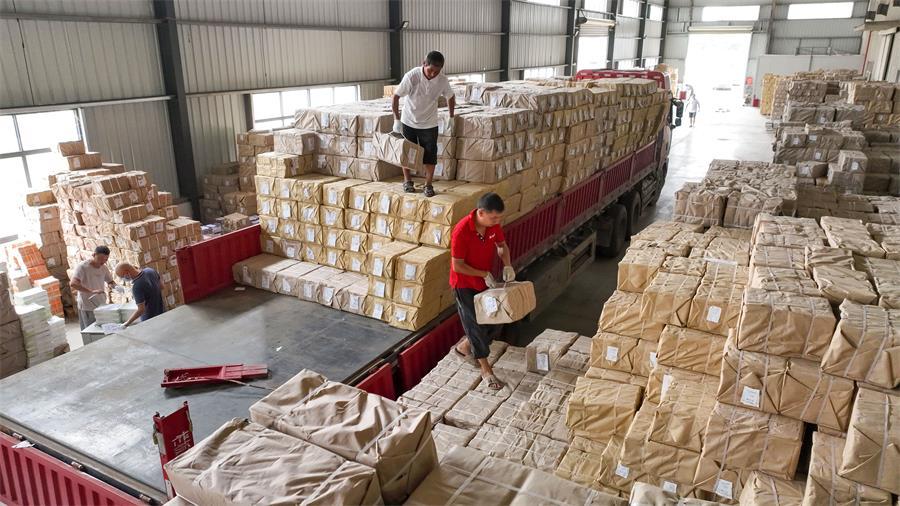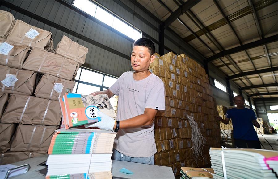 8月10日,工作人员在赣州市新华书店仓库打包、分拣秋季学期课本教材和教辅资料。赣州市新华书店积极做好全市中小学教材和教辅资料的清点、搬运、分发、配送等工作,确保教材按时到位,为新学期开学做好准备。特约记者 胡江涛 摄