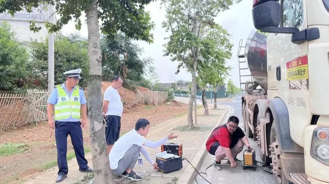 工作人员在现场指挥车辆有序排队开展检测,委托有资质的第三方检测机构通过便携式尾气检测设备对途经和谐大道的柴油车开展尾气检测,核定其尾气是否达标排放,针对超标排放车辆,由区交警大队现场予以处罚。