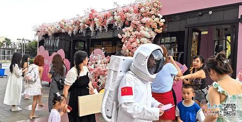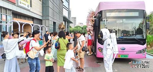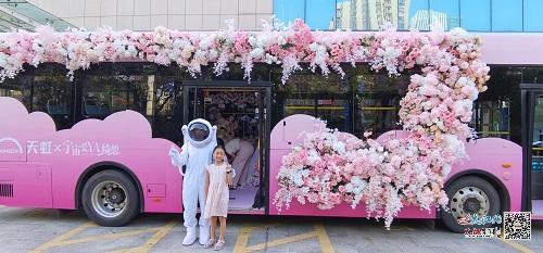 到站停靠期间,游客可免费上下“心动巴士”游览拍照,与“宇航员”互动。 8月19日下午,粉色大巴刚到站停稳,游客们便纷纷聚集过来拍照打卡,现场人气十足。“老远就看到粉色大巴了,从内到外都充满了浪漫气息。今天不光饱了眼福,还收到了鲜花,今年的七夕节一定会特别有意义。”乘客们纷纷表示被南昌的浪漫惊艳到了。